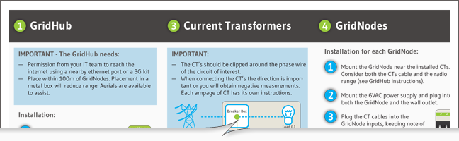 The details from this document in PDF form. A great overview of how a GridSpy solution is installed to monitor your power usage. This guide clearly shows how the pieces fit together.